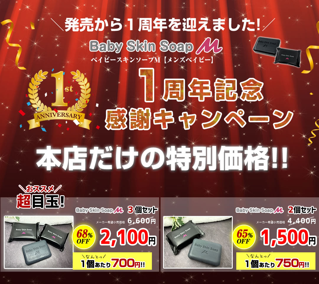 ★超目玉 65%OFF!!★ 【メンズベイビー1周年記念!本店だけの特別価格】ベイビースキンソープM(2個セット)【愛称:メンズベイビー】80gx2個