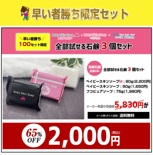 \早い者勝ち/【※100セット限定※】65%OFF!! 当店自慢の石鹸が!全部試せる石鹸3個セット【メンズベイビー80g+ベイビーちゃん80g+フコちゃん75g】【メール便】