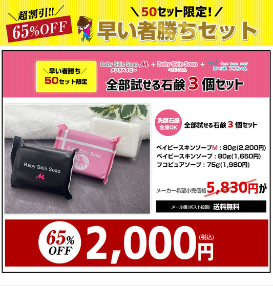 \早い者勝ち/【※50セット限定※】65%OFF!! 当店自慢の石鹸が!全部試せる石鹸3個セット【メンズベイビー80g+ベイビーちゃん80g+フコちゃん75g】【メール便】