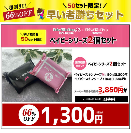 \早い者勝ち/【※50セット限定※】★総額3,850円⇒1,300円送料無料★ 66%OFF!!【ベイビースキンシリーズ石鹸2個セット|メンズベイビー80g+ベイビーちゃん80g】 【メール便】