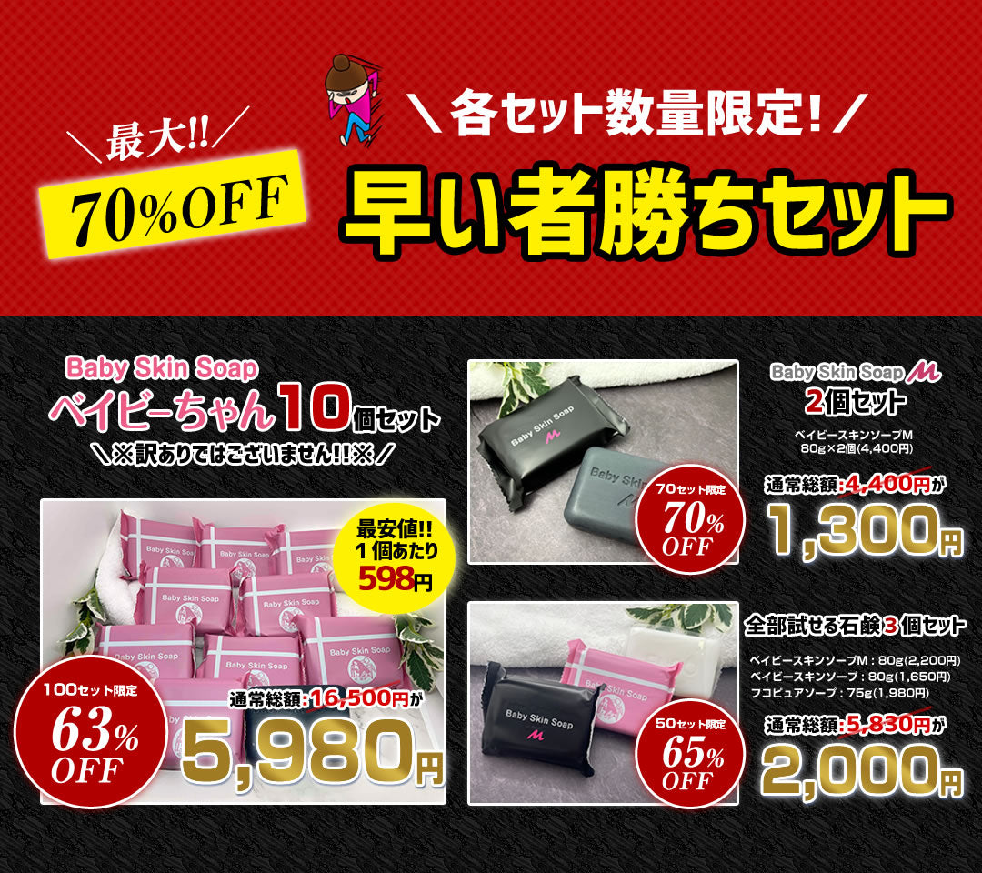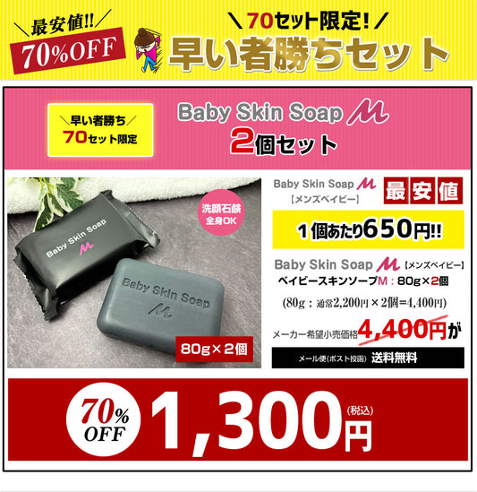 \早い者勝ち/【※70セット限定※】70%OFF!! ベイビースキンソープM(2個セット)【愛称:メンズベイビー】80gx2個セット
