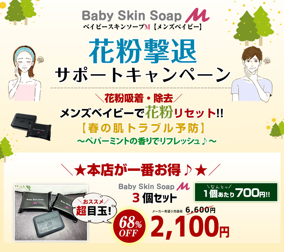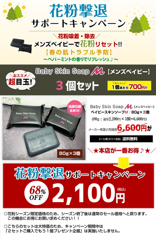 ★超目玉 68%OFF!本店が一番お得♪★ 【花粉撃退サポートキャンペーン】ベイビースキンソープM(3個セット)【愛称:メンズベイビー】80gx3個